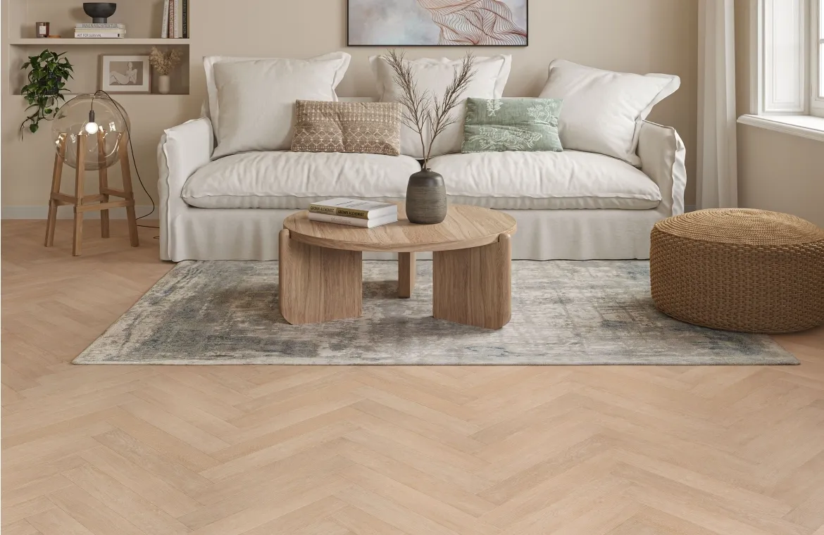 Accent 2mm Soft Hazel Oak LVT flooring in herringbone/parquet style with square edges. 0.3mm wear layer, 457×76mm planks. Glued-down installation, compatible with underfloor heating and suitable for all rooms. Durable, stylish, and easy-to-maintain LVT flooring for modern interiors.