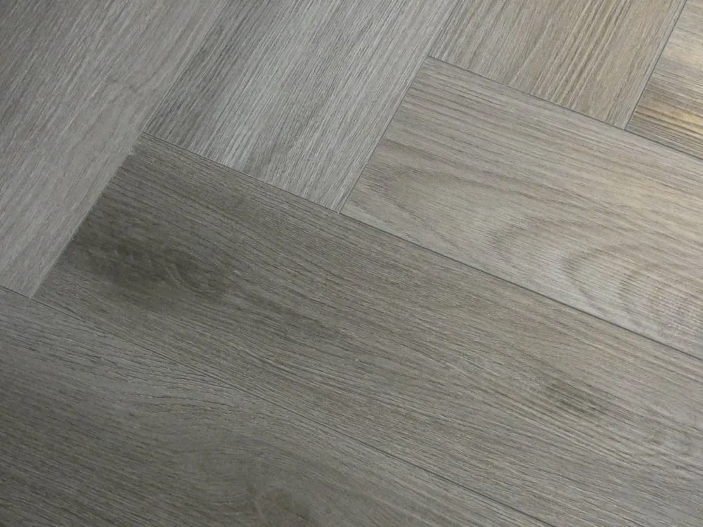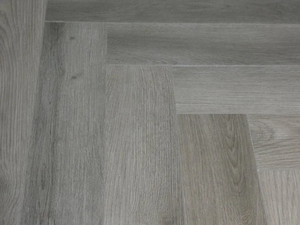 Dark grey herringbone parquet flooring with a textured wood finish. 5mm thick and 126mm wide, easy to install. Adds a seamless, elegant touch to contemporary and traditional interiors, providing durable and stylish parquet flooring for any room.