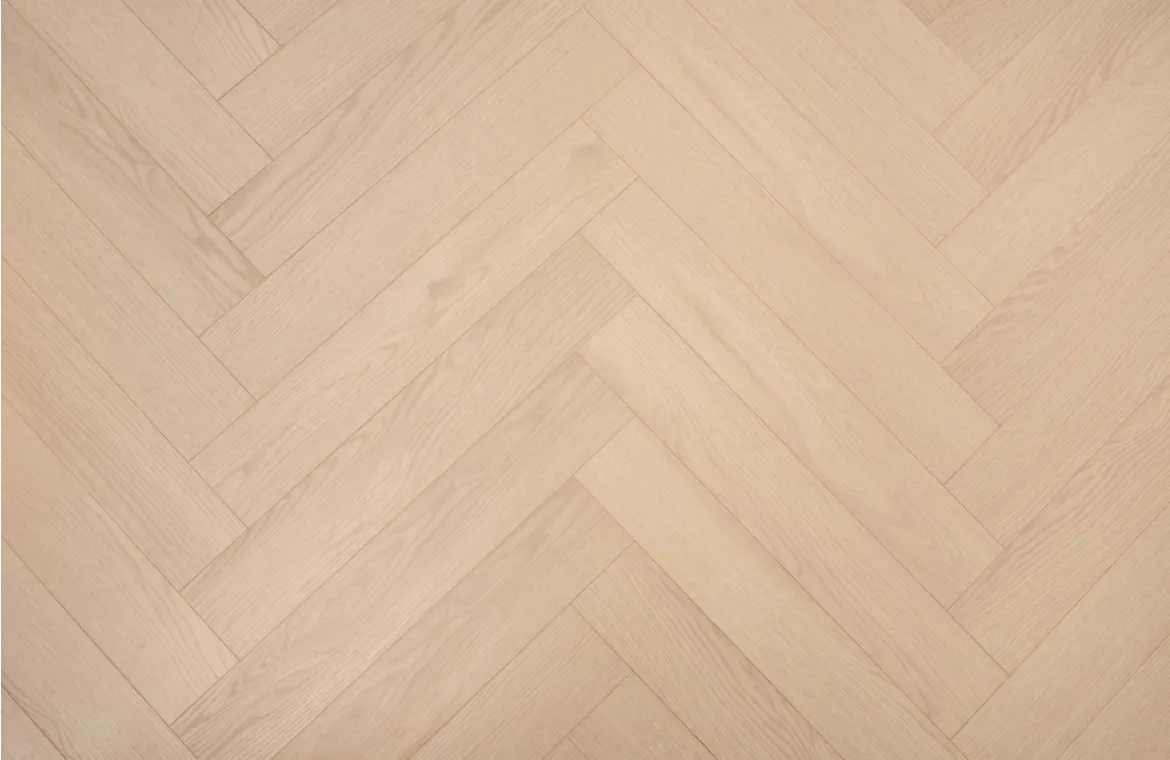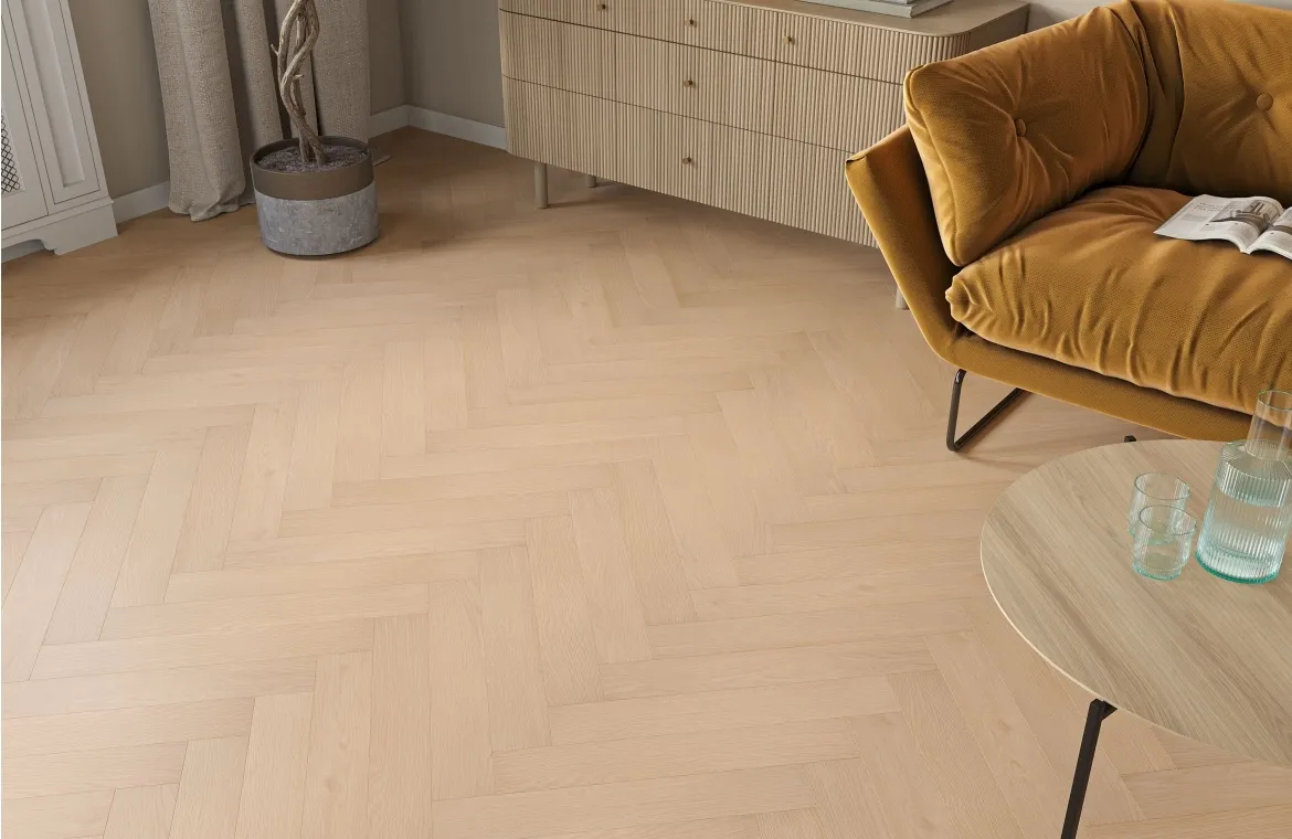 Empire 12mm Hazel Oak laminate flooring in herringbone/parquet style. Click system for floating installation, compatible with underfloor heating. Suitable for all rooms except bathrooms. Durable, low-maintenance, and stylish flooring for modern and traditional interiors.