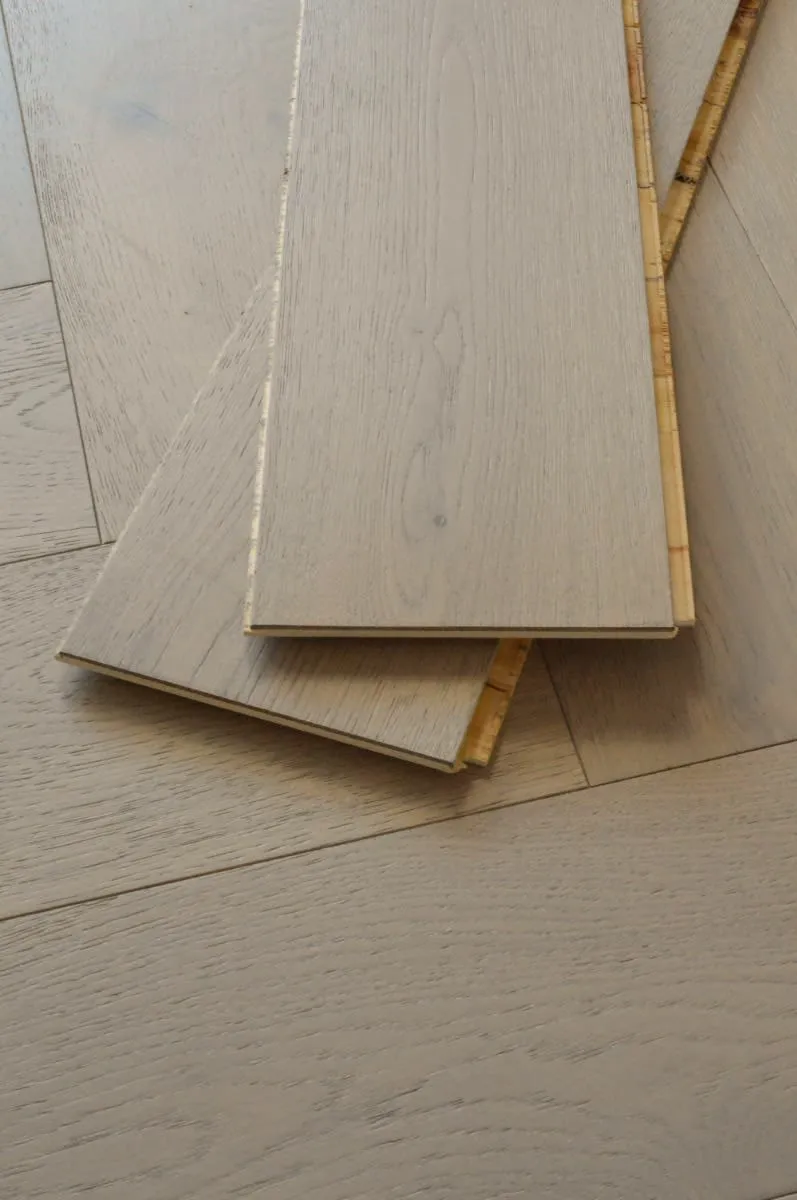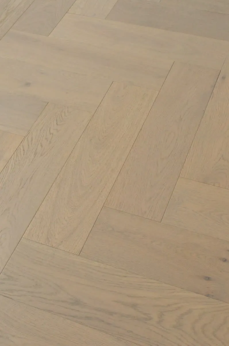 Engineered grey oak parquet flooring with brushed and oiled finish for a textured, sophisticated look. Each board has a 3mm veneer, refinishable up to three times. Durable and elegant, ideal for long-lasting, stylish flooring in any room.