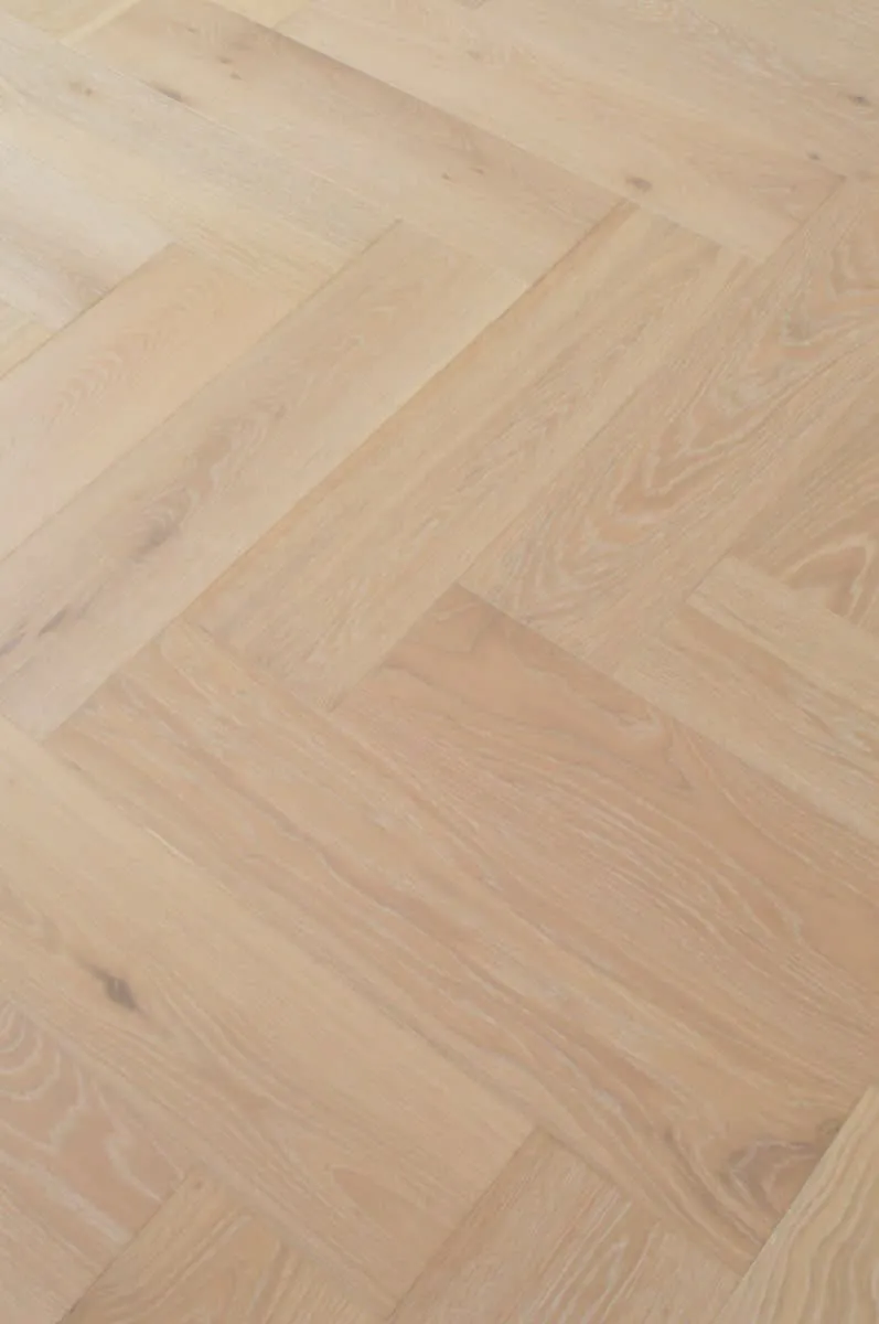 Engineered whitewash oak parquet wood flooring with brushed, matt lacquered finish for a textured, elegant look. Each board has a 3mm veneer for sanding and refinishing up to three times. Adds lasting beauty and luxury to any room.